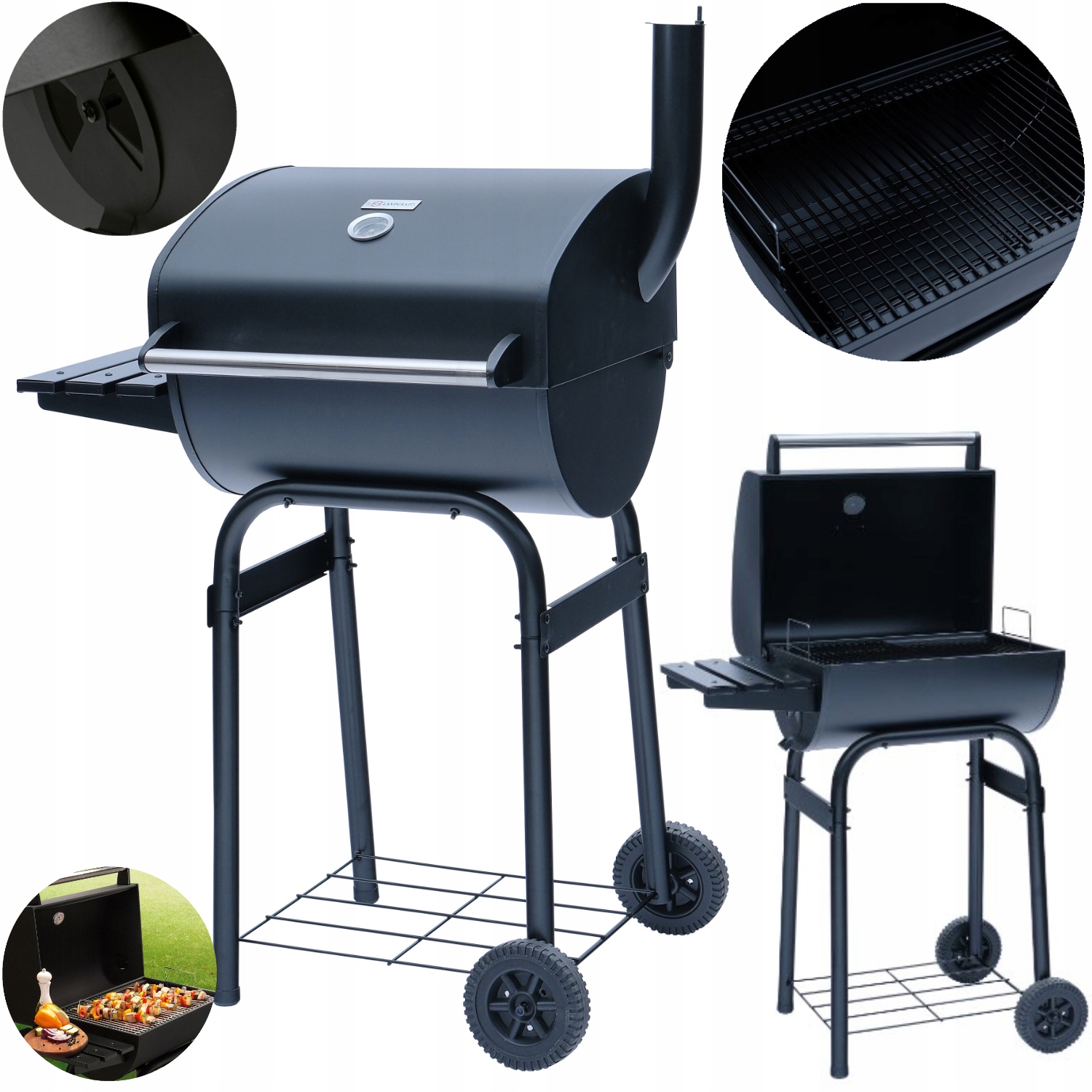 Dzięki temu, że grill ogrodowy Landgraf posiada pokrywę, daje nam o wiele większe możliwości. Przygotujemy na nim bardziej wymagające potrawy takie jak duże kawałki mięsa, warzywa a nawet pizzę. Oprócz tego, że może posłużyć nam jako zwykły grill bez pokrywy, może zastąpić nam piekarnik w plenerze. Dzięki możliwości cyrkulacji powietrza uzyskamy efekt termoobiegu, który równomiernie rozprowadzi powietrze w środku. Termometr pozwala na precyzyjne kontrolowanie temperatury wewnątrz grilla (do 300 stopni Celsjusza). Odczyt jego wskazań jest niezwykle łatwy, natomiast skala wyraźnie pokazuje zakres temperatur odpowiedni dla różnych rodzajów mięs.Zacznij sezon grillowy z nowym wysokiej jakości grillem ogrodowym